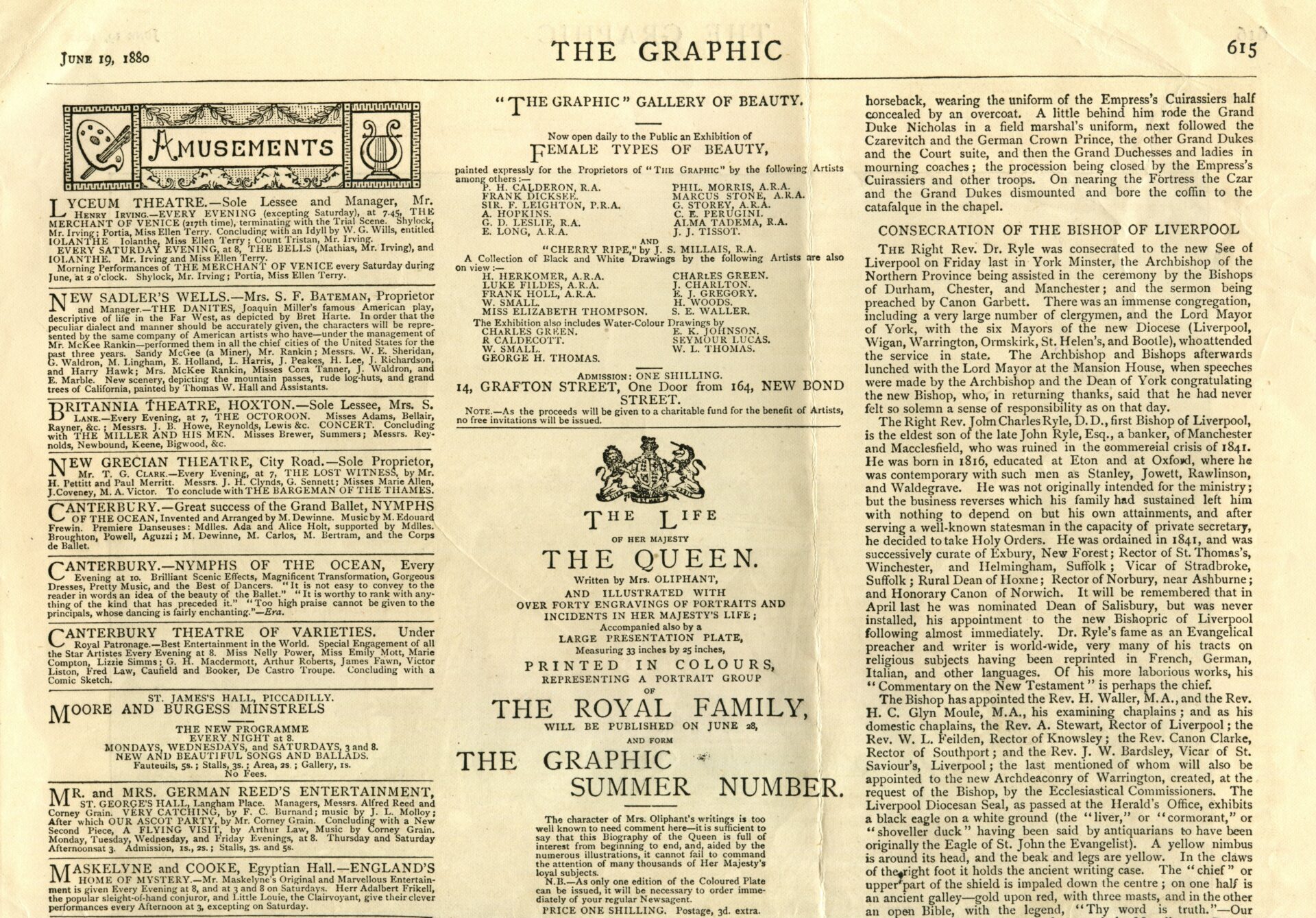 This advertisement in ‘The Graphic’ for Maskelyne and Cooke and Herr Adalbert Frikell at the Egyptian Hall is dated 19 June 1880. Little Louie, the Clairvoyant, is also mentioned as performing with Herr Adalbert Frikell. The advertisement is small, as was typical at the time. The second illustration here shows half of the newspaper page, providing examples of competing entertainments in London.