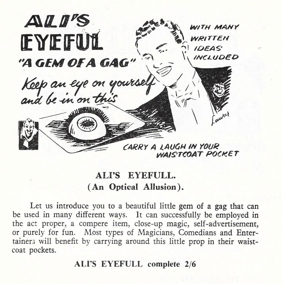 Although this is just a gag, it can be used in many ways, including having some fun with a magic tricks. For example, a magician could put a card face down on the table and say “We must keep an EYE on that card”. The eye comes with a whole host of printed ideas for its use, copyright by L. Davenport & Co., London. Television and American Rights Reserved. Also illustrated here is the Davenports advertisement.