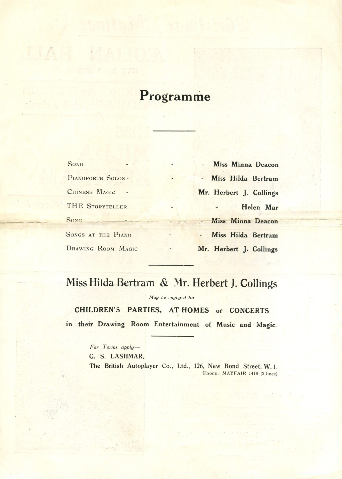 The year is not mentioned, but from item N3710 we can guess the year is circa 1922. Hilda Bertram was the wife of Herbert J. The programme also advertises that they may be engaged for children’s parties, at-homes or concerts in their Drawing Room Entertainment of Music and Magic.