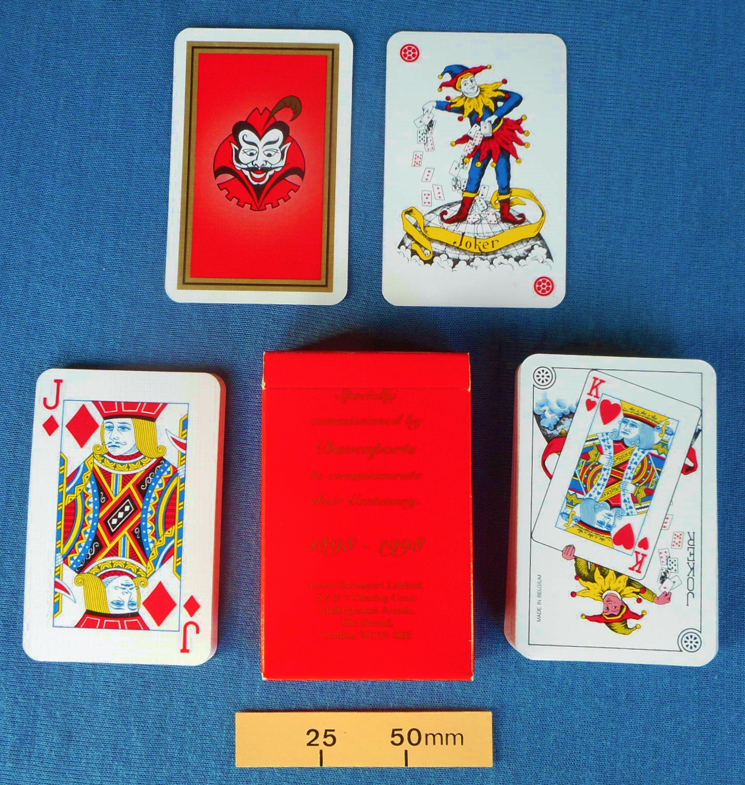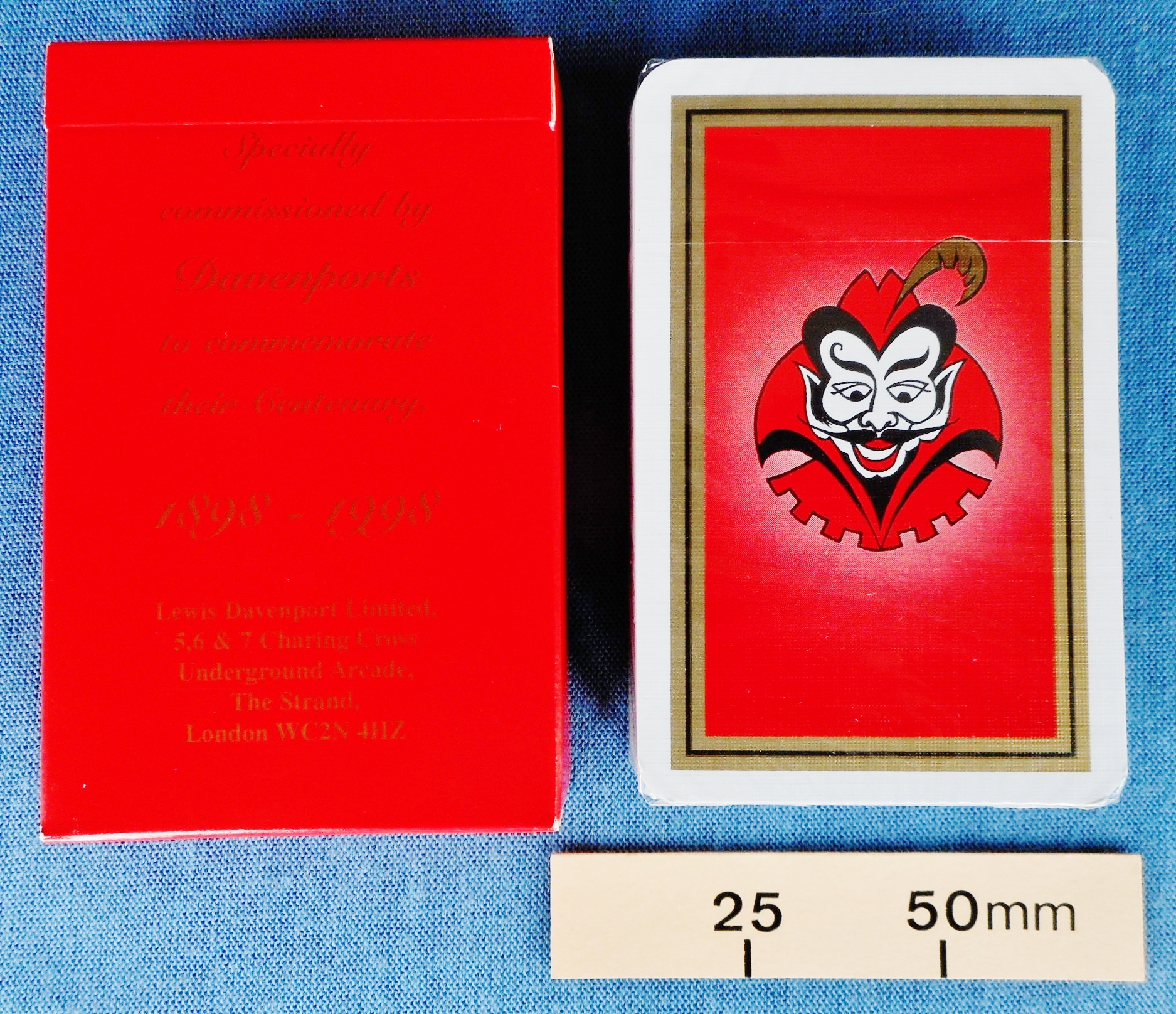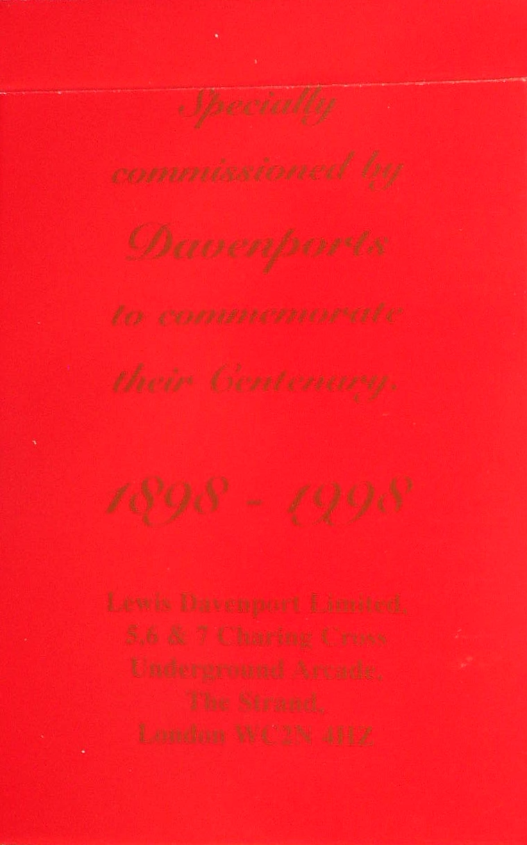 The pack was specially commissioned by Davenports to commemorate their Centenary 1898 – 1998. This version of the Davenport demon trademark had been drawn by Ali Bongo. The cards were manufactured by Carta Mundi in Belgium.