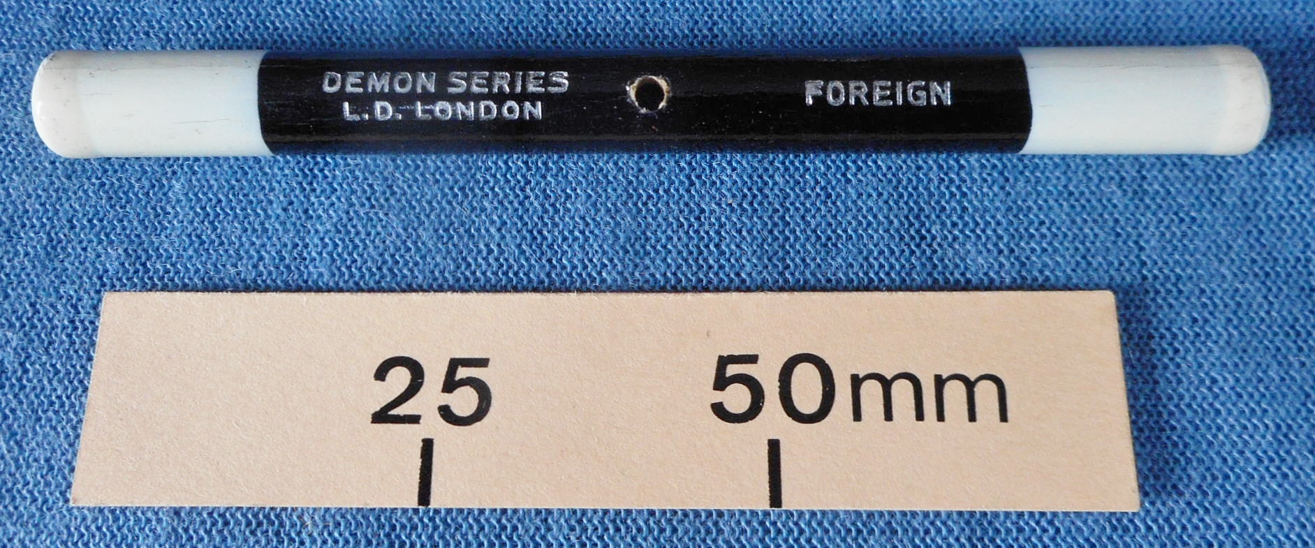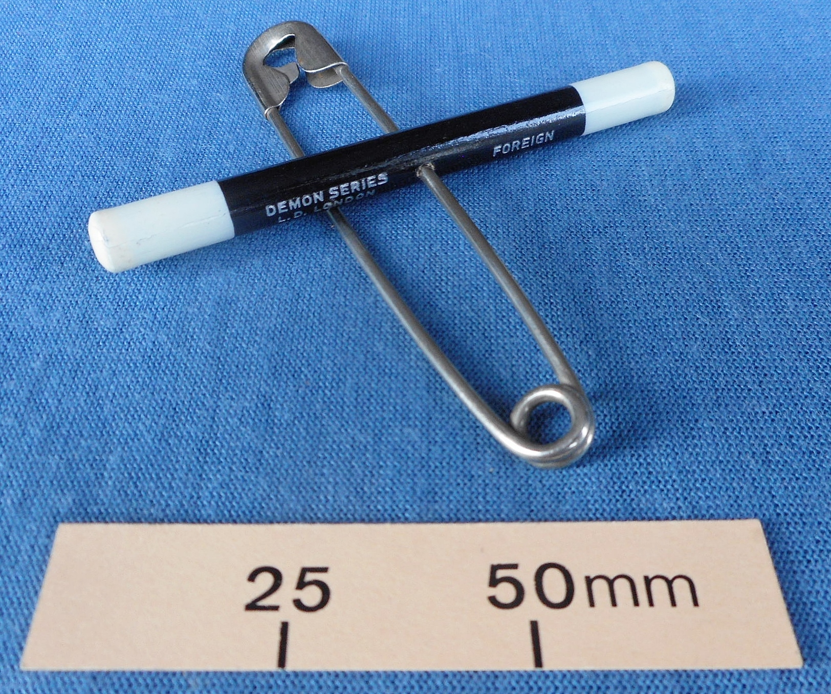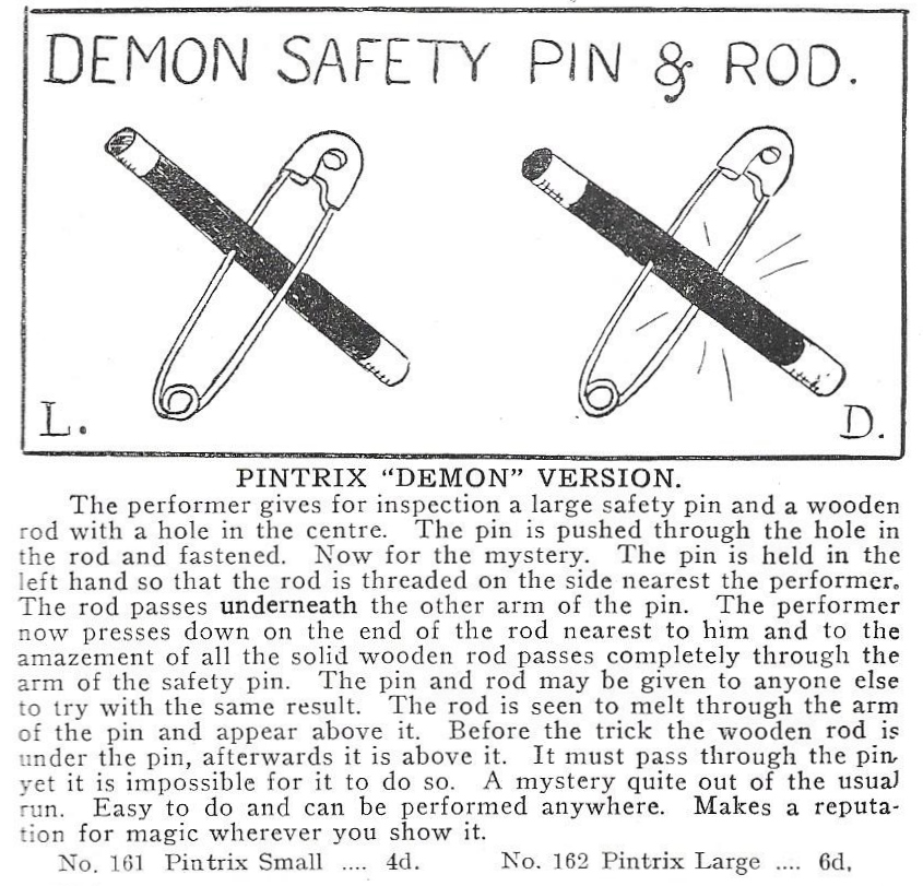 The performer gives for inspection a large safety pin and a wooden rod with a hole in the centre. The pin is pushed through the hole and fastened. The rod is then moved so that one side is underneath the other arm of the pin. Instantaneously, the rod is made to appear to penetrate the arm of the safety pin. The effect is quite startling. Davenports were still selling these rods and pins in the 1990s, complete with instructions. Also illustrated here is an early Davenport advertisement for this trick in two sizes: Pintrix Small for 4d and Pintrix Large for 6d. Note that the rod has DEMON SERIES L.D. LONDON FOREIGN on it. The rods would have been imported from Germany. This particular example and instructions came from Davenports in 1994. See N3010 for a smaller version of this trick.