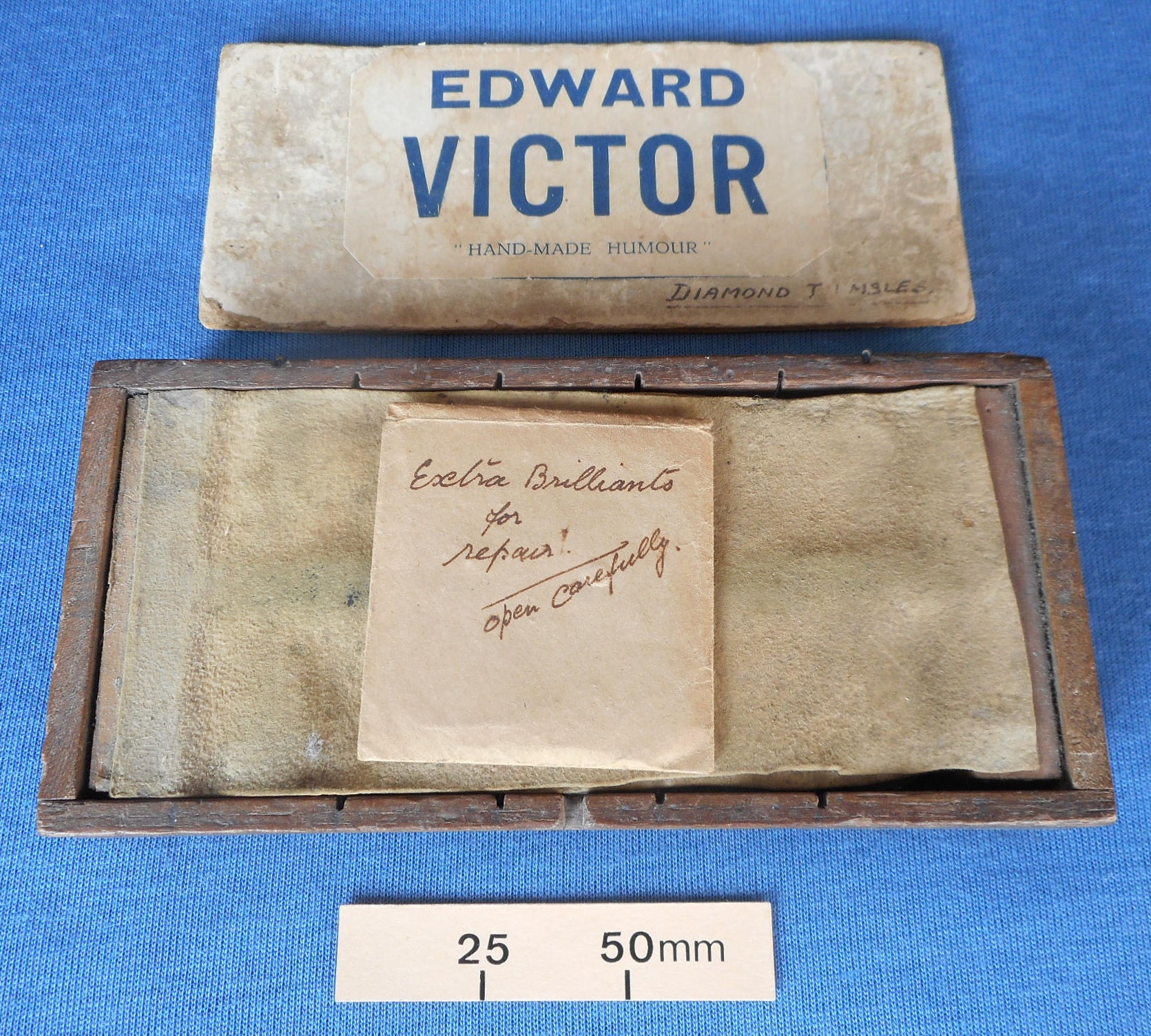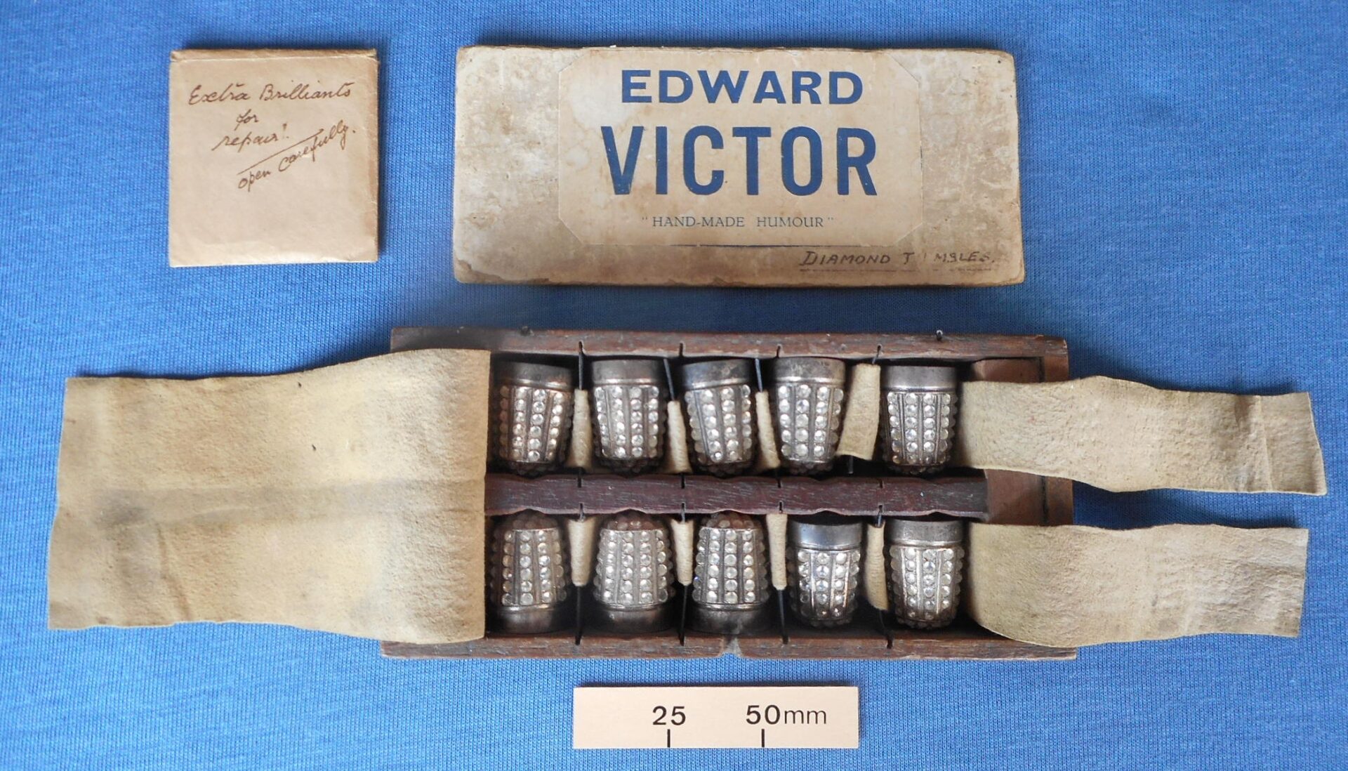 Edward Victor (1887-1964) was well known for his skilful and entertaining magic and hand shadows. He had excellent manipulation skills and, like many magicians, included tricks with thimbles. The small size of thimbles often made it difficult for them to be seen throughout a large theatre. To overcome the problem magicians would use bright colours or, as in the case with Victor, cover them in glass brilliants that would sparkle in the spotlight. This storage box used by Victor shows the care he took to keep his manipulation thimbles in top condition.