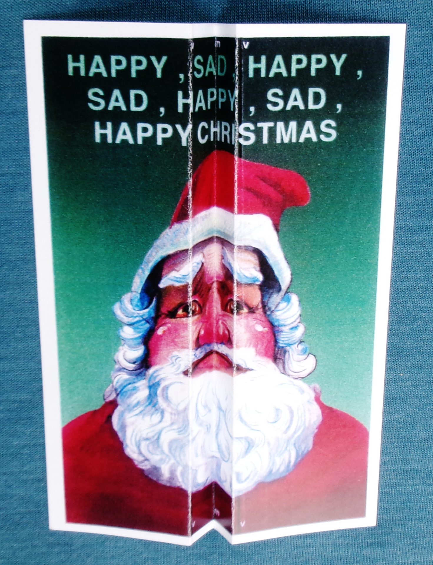 This entertaining illusion is made possible because the card has a triple fold up the middle. If you pull the card halfway open and tilt Santa’s head away from you, he appears to smile. To make him sad simply tilt his head towards you. The photographs will make this clear.