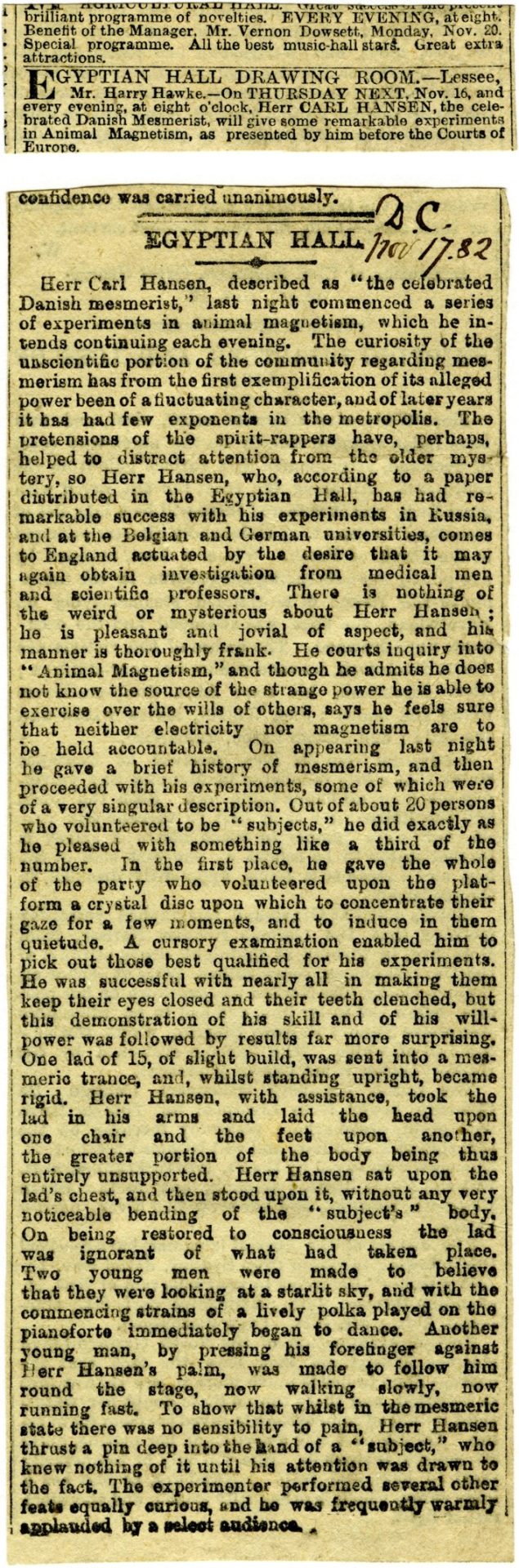 Herr Carl Hansen with experiments in animal magnetism, Egyptian Hall 1882