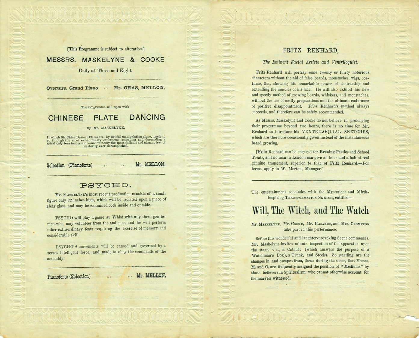 Maskelyne and Cooke Egyptian Hall programme. Someone has written on the cover of the programme the date 1875. This would be consistent with Psycho being in the programme. Psycho was introduced by Maskelyne on 13 January 1875. In the early days, Psycho only played whist, as on this programme. Later on, Psycho performed other tasks as well as whist.