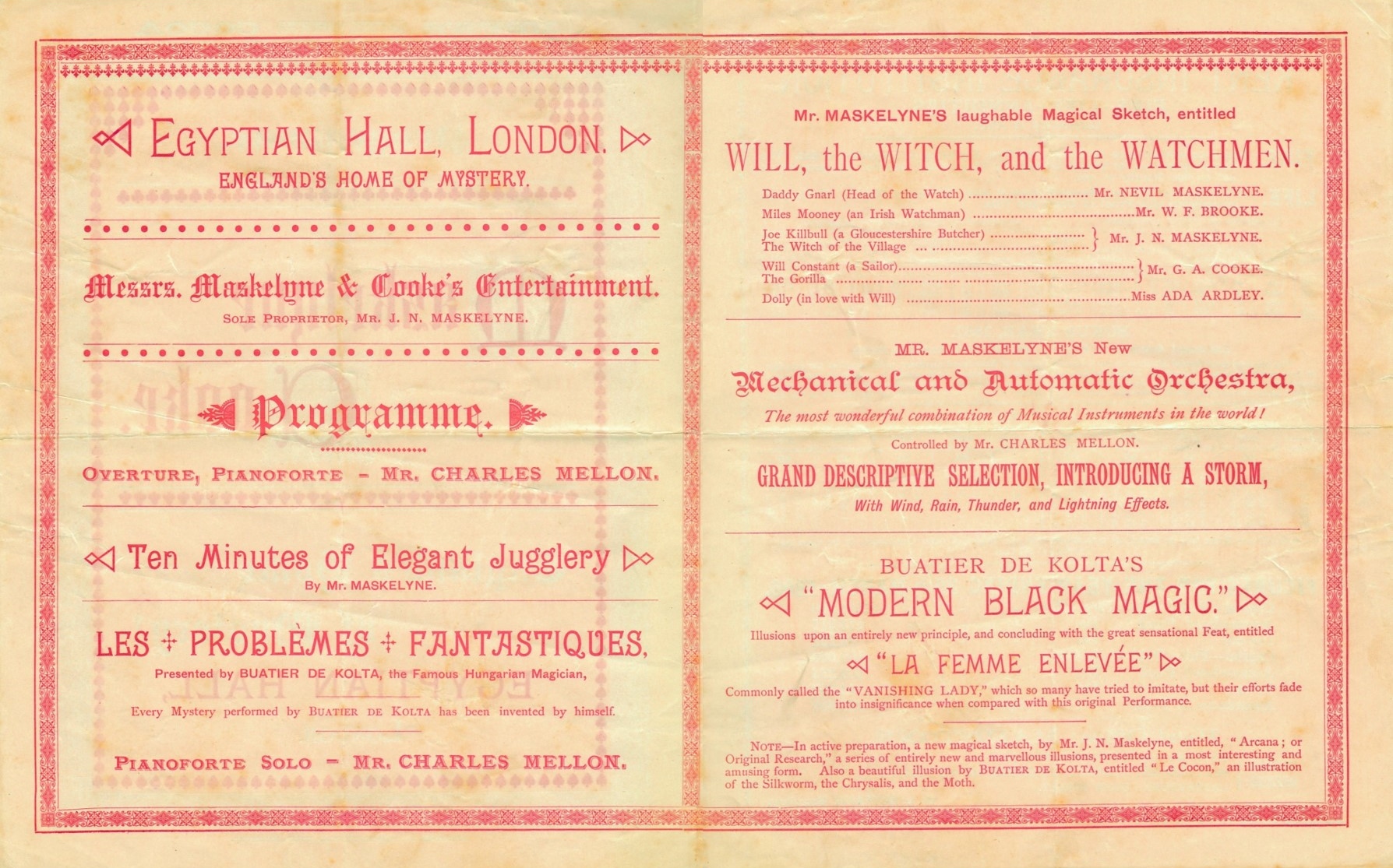 | Acts | Mr. Charles Mellon; Jugglery by Mr. Maskelyne; Buatier de Kolta; 'Will, the Witch and the Watchmen' sketch; Mechanical and Automatic Orchestra |