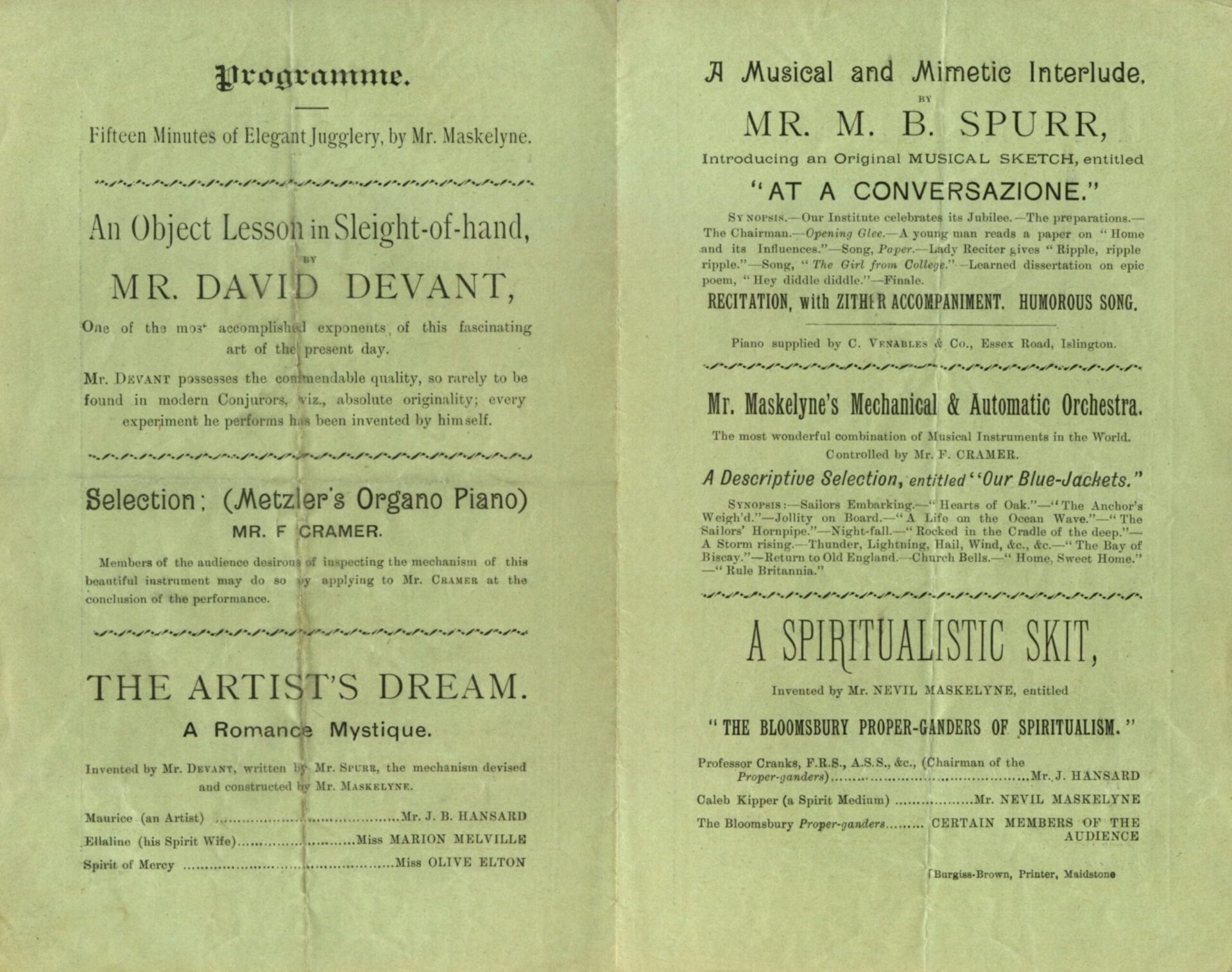 Acts Mr. Maskelyne with elegant jugglery; Mr. David Devant; ; Mr. F. Cramer on Metzler's Organo Piano; 'The Artist's Dream'; Mr. M.B. Spurr; Mechanical and Automatic Orchestra; the sketch 'The Bloomsbury Proper-ganders of Spiritualism'.