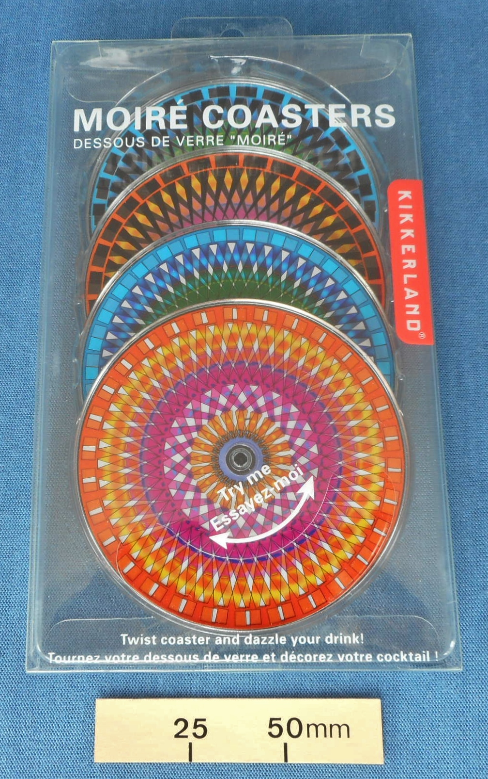 A set of four coasters which form changing moiré patterns when rotated. The best way to see the effect is to put a coaster on the table where it is held in place by its non-slip base. It is then easy to use your fingers to rotate the top part of the coaster to reveal the ever changing patterns. Bought by John Davenport from Grand Illusions in October 2012. Made in China for Kikkerland Design.