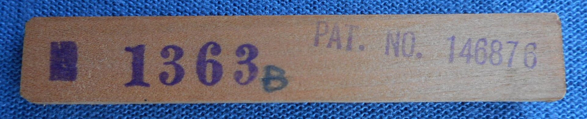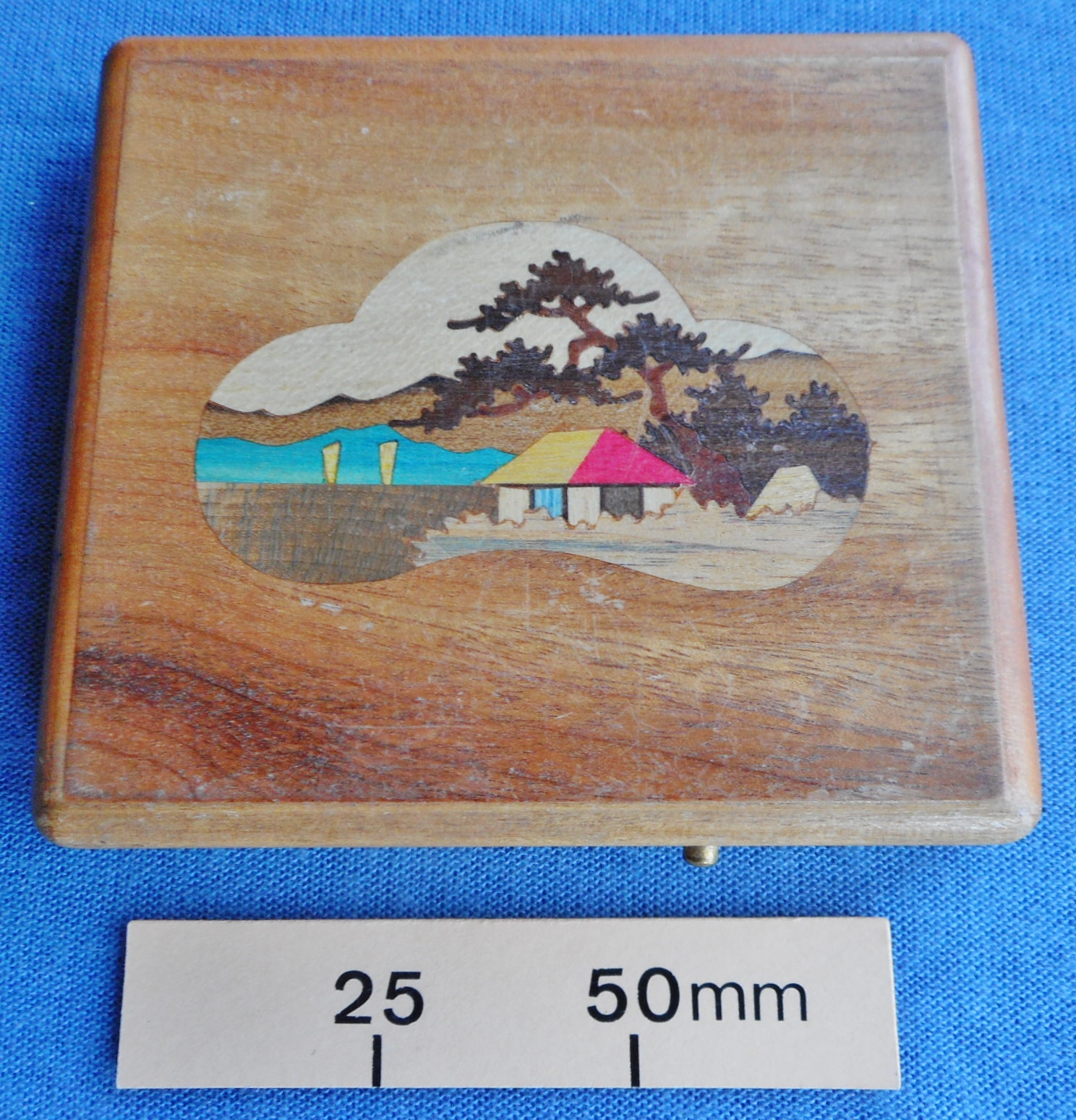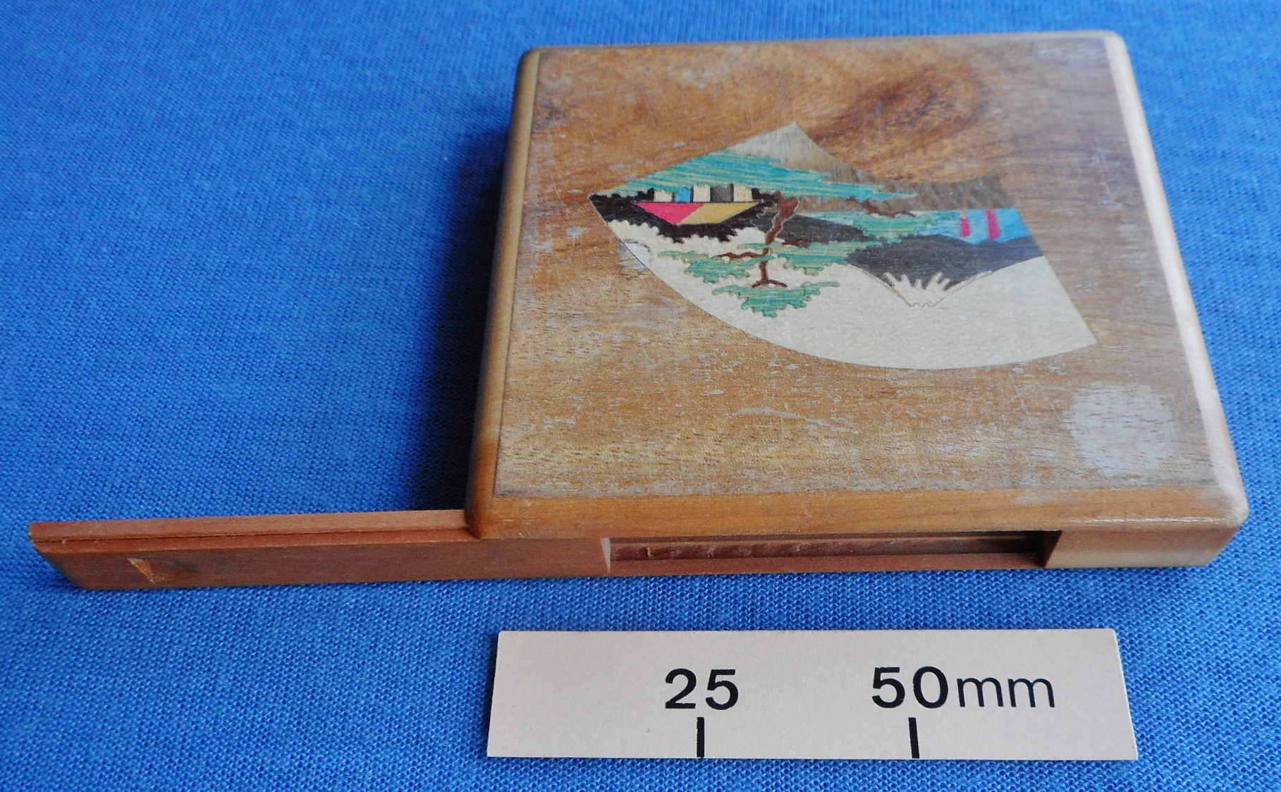 Fill this box up with cigarettes and when you want to offer one to a friend, simply press the small metal knob and a cigarette automatically shoots out. The case is filled with cigarettes by opening up a wooden slide on the side of the case. A patent number is given on the inside of the slide. Made in Japan.