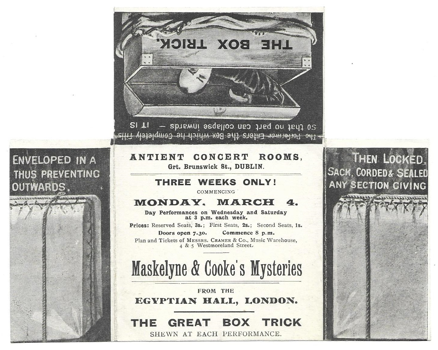 Novelty give away advertisement for Maskelyne and Cooke’s Mysteries at the Antient Concert Rooms, Dublin. Commencing 4 March 1901