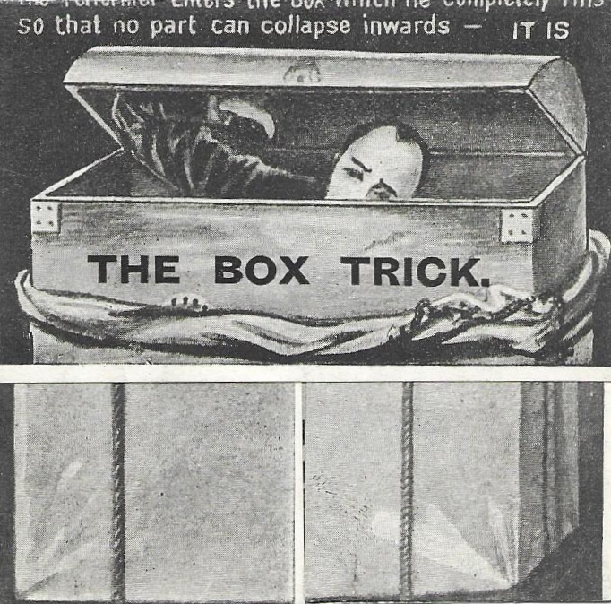 This advertisement can be folded to show The Box Trick in action. The words explain: ‘The performer enters the box which he completely fills so that no part can collapse inwards. It is then locked, enveloped in a sack, corded and sealed thus preventing any section giving outwards. Yet in a few seconds the gentleman escapes without disturbing a single knot, leaving the box perfectly empty.’