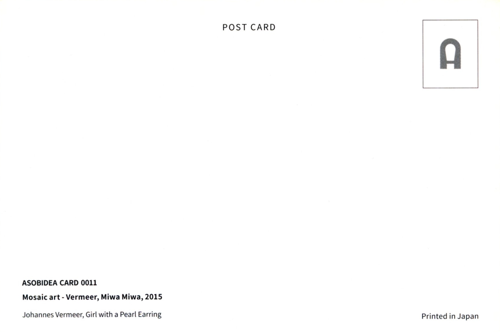 This card is ASOBIDEA CARD 0011. Mosaic art – Vermeer, Miwa Miwa, 2015. The image is Johannes Vermeer’s Girl with a Pearl Earring. Printed in Japan.