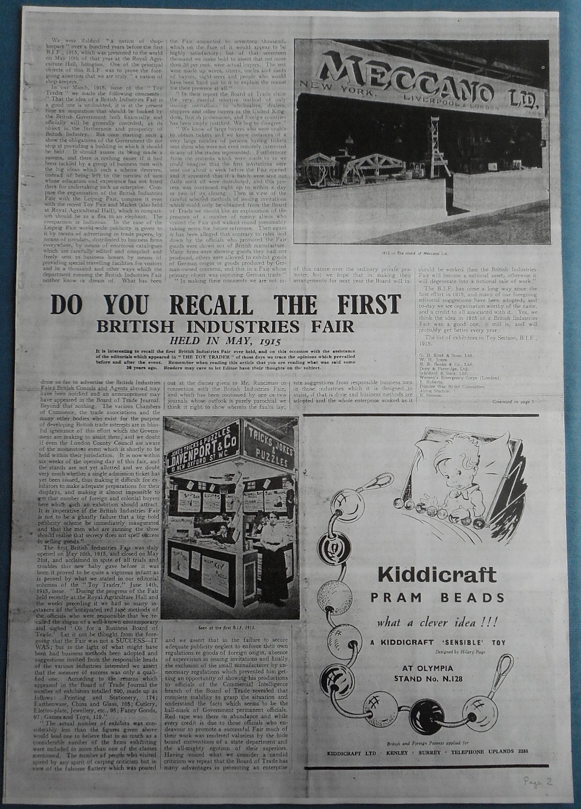 We know that this photograph was taken at the 1915 B.I.F. because The Toy Trader and Exporter of Thursday 3 May 1951 published it as part of a look-back to the first B.I.F. at the Royal Agricultural Hall, Islington. Lewis Davenport is sitting within the stand. We do not know who the lady is. Hanging from the corner column of the stand are several catalogues with the Union Jack on the cover. This catalogue, item N1559, which is also illustrated here, shows that the flag was printed in colour and the message on the cover ‘All British Catalogue’ is entirely appropriate for the Fair. However, from the contents of the catalogue, it is doubtful that the message is entirely true.