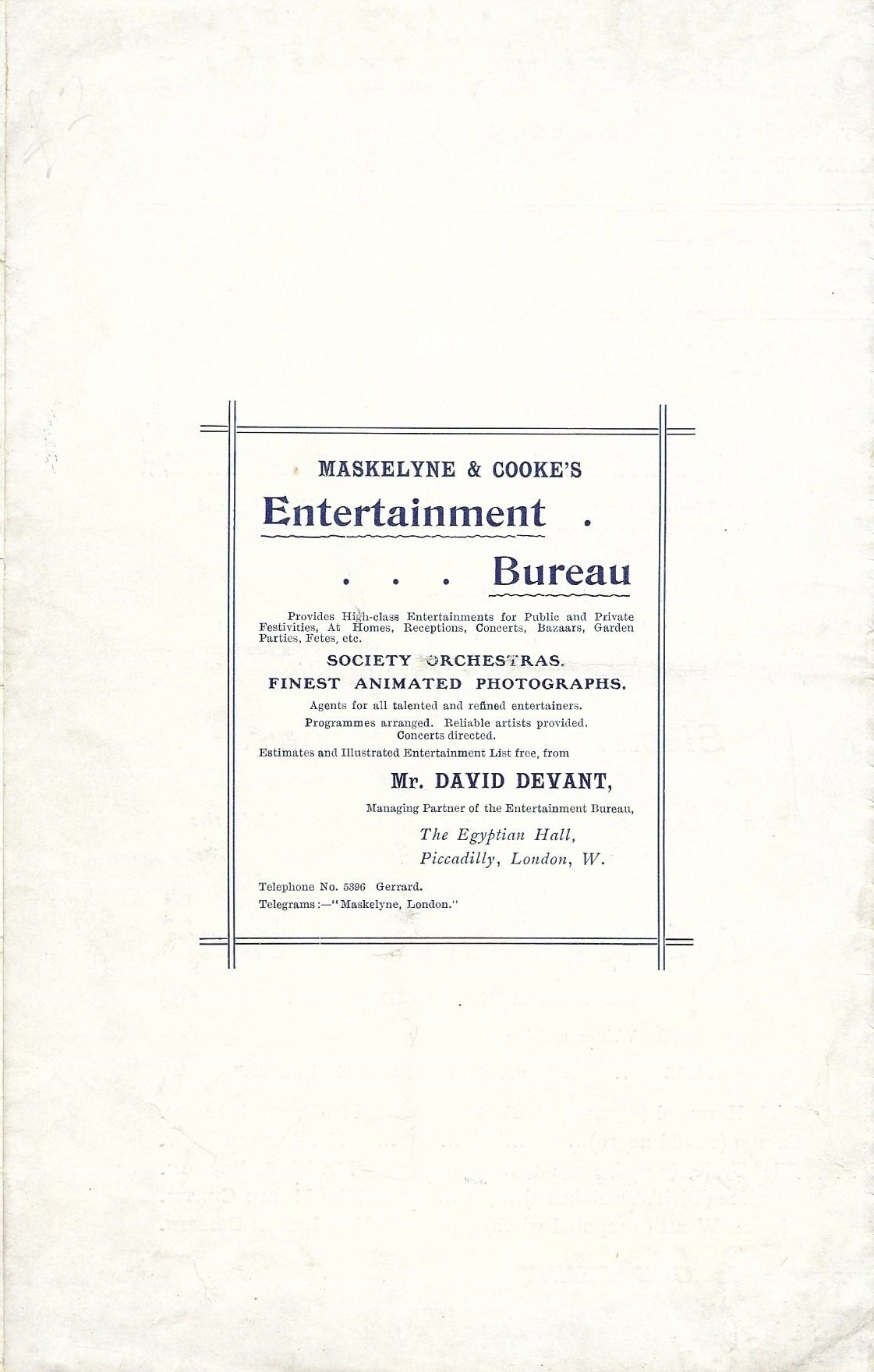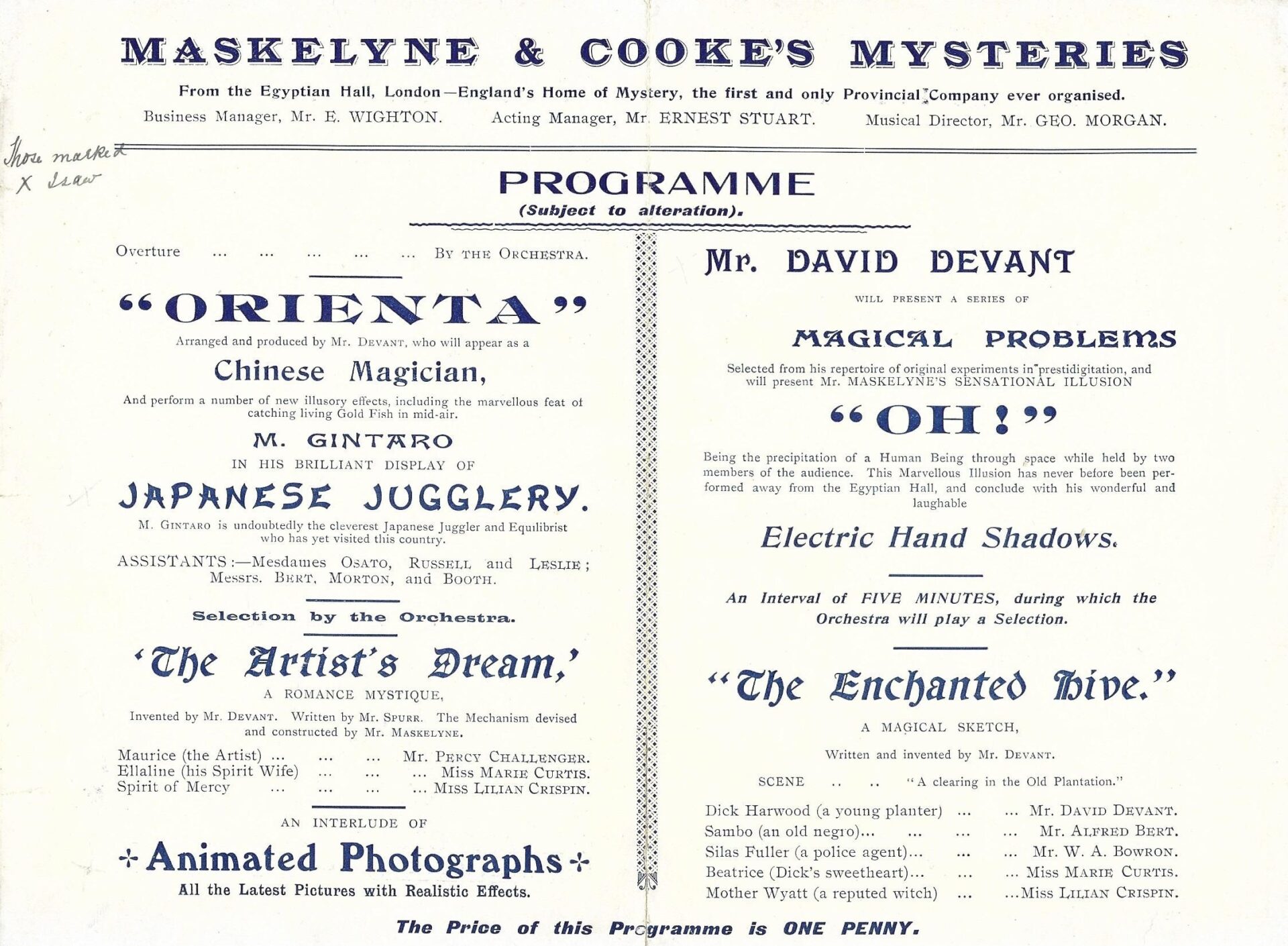 According to Devant in his book ‘My Magic Life’ the sketch ‘The Enchanted Hive’, which is on this programme, was first introduced on 8 December 1902. If Devant was correct, this programme must therefore be dated 8 December 1902 or later. If so, the pencil date of 17 January 1900 on the programme’s cover must be incorrect. The bill includes David Devant.