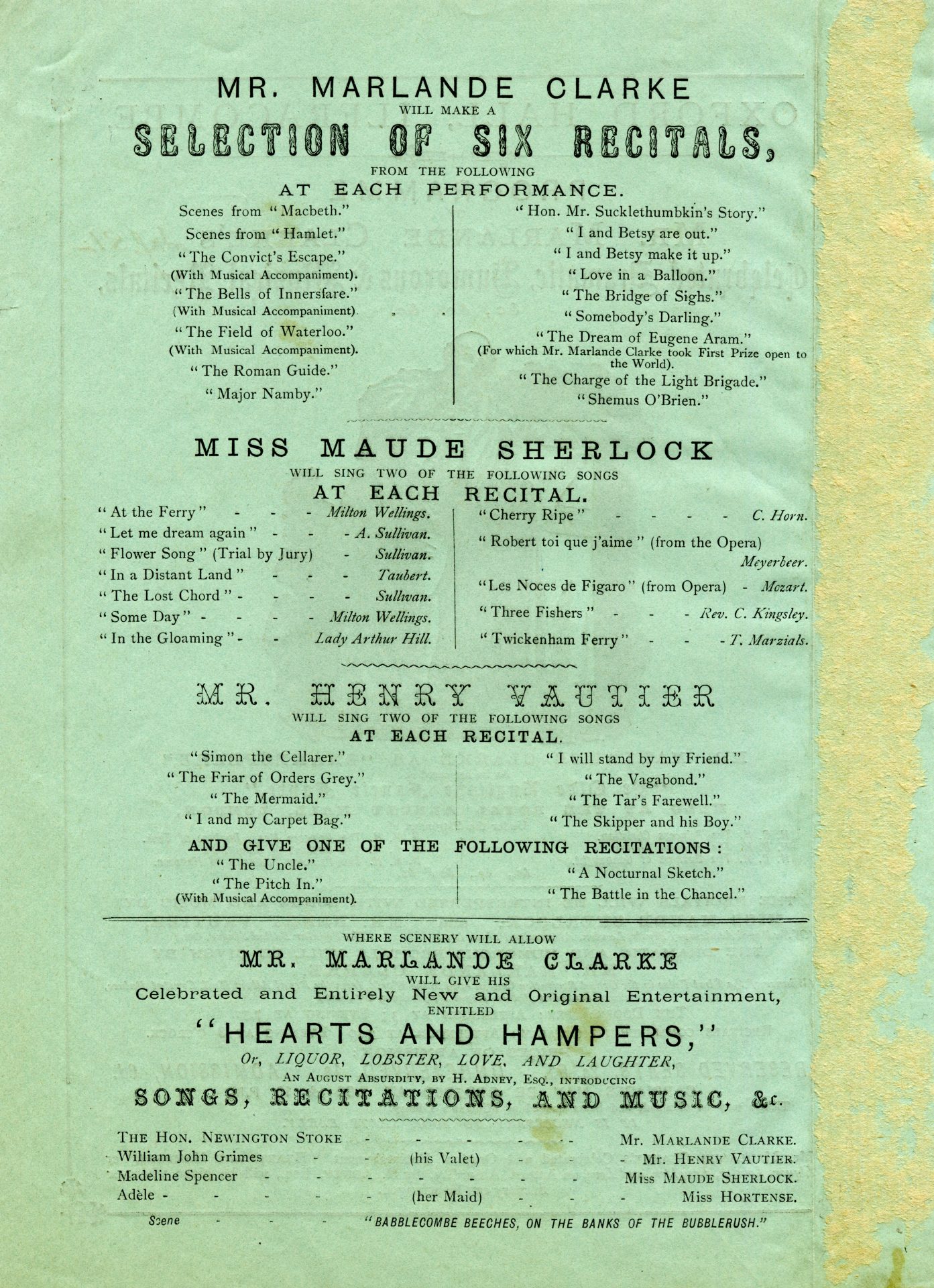 Programme for Mr Marlande Clarke at the Oxford Hall, Ilfracombe, 1881