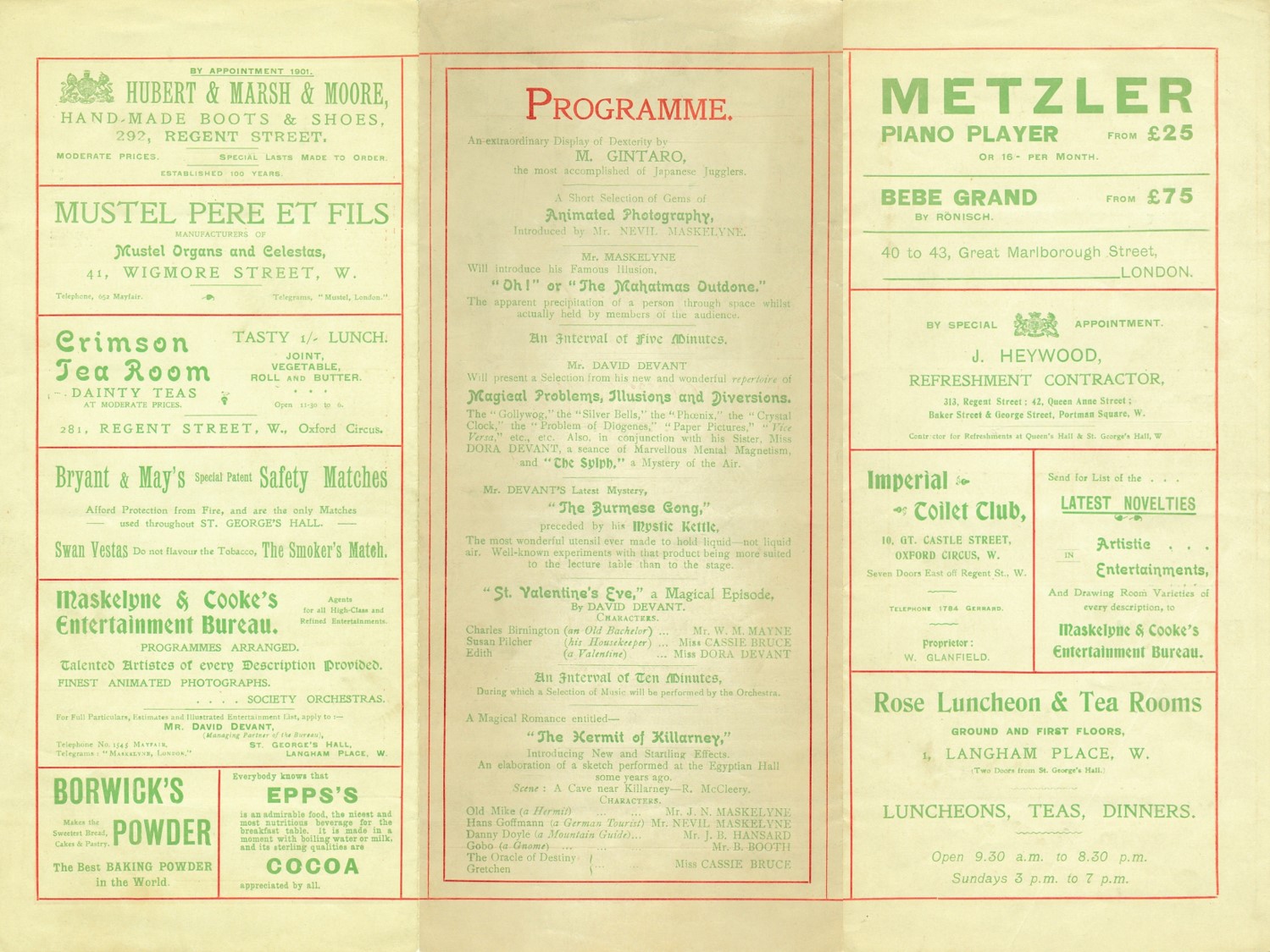 Acts M. Gintaro; Mr. Nevil Maskelyne introducing Animated Photography; Mr. J.N. Maskelyne with 'Oh!' or 'The Mahatmas Outdone'; Mr. David Devant; 'St. Valentine's Eve' sketch; 'The Hermit of Killarney' sketch