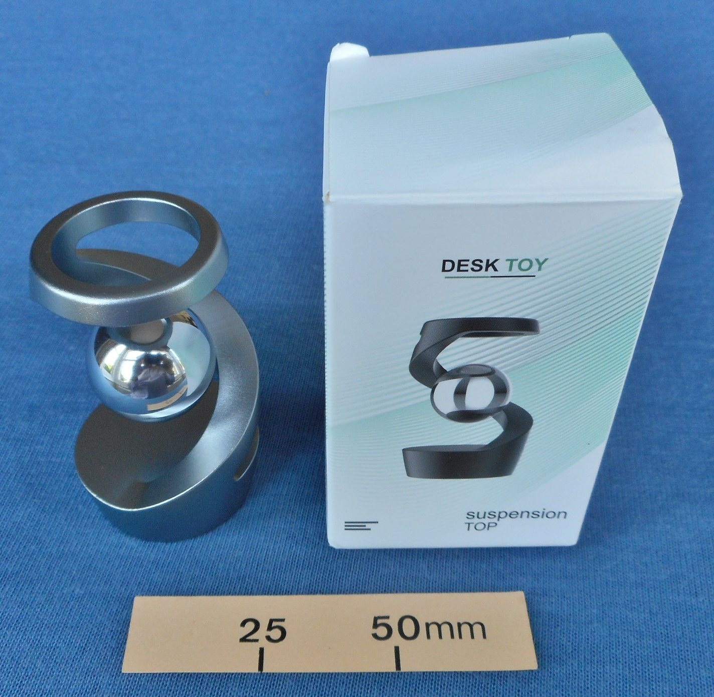 This is a very appealing novelty. When put on a flat surface and spun, the effect you see is of a rotating grey cage with a large ball bearing mysteriously stationary in the middle of it. Made in China and sold via YH Consulting Limited based in Staines-upon-Thames, England.