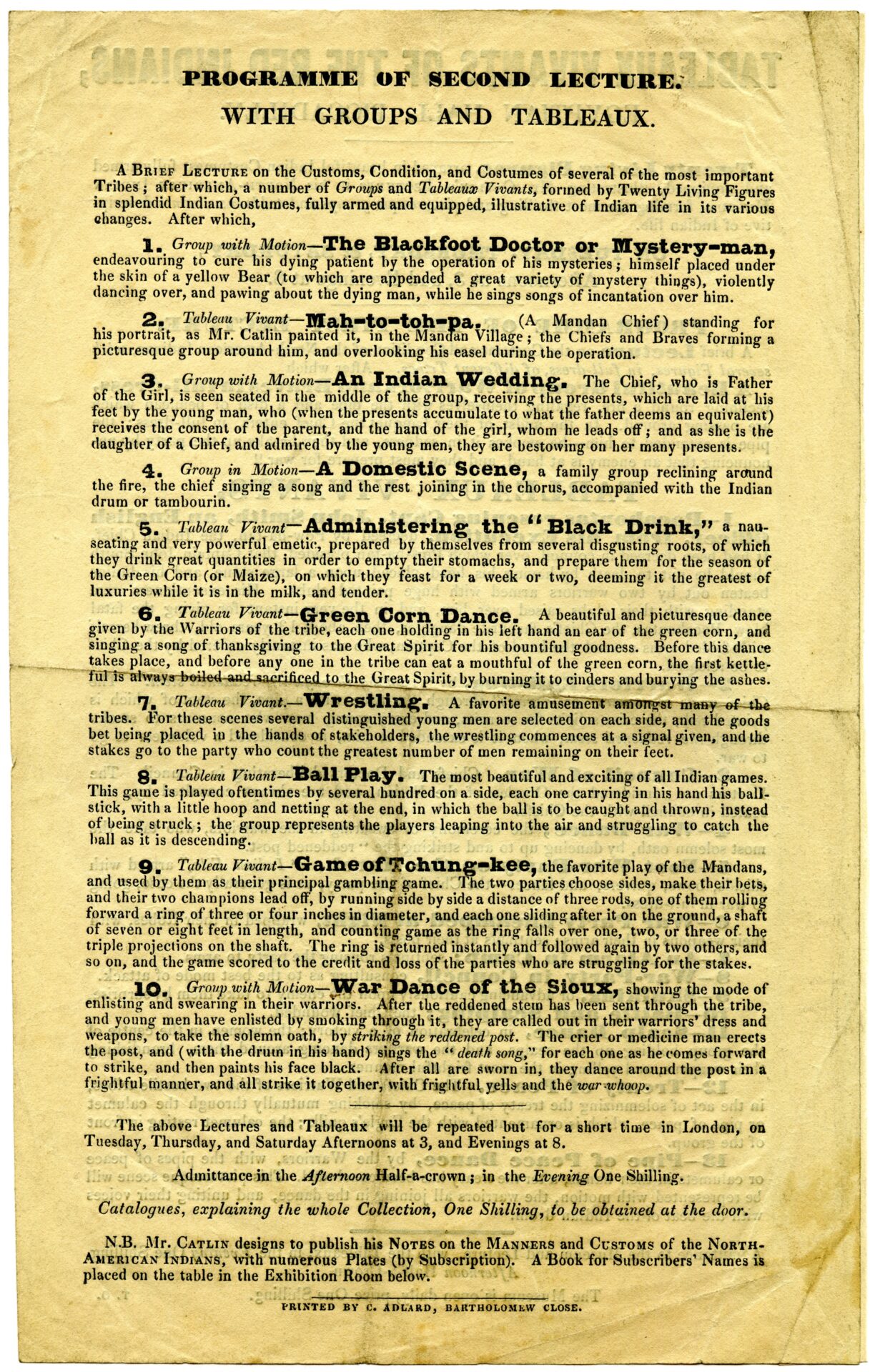 This double sided handout describes how the Tableaux Vivants accompany Mr. Catlin’s lectures in his North-American Indian Museum housed in the Egyptian Hall.