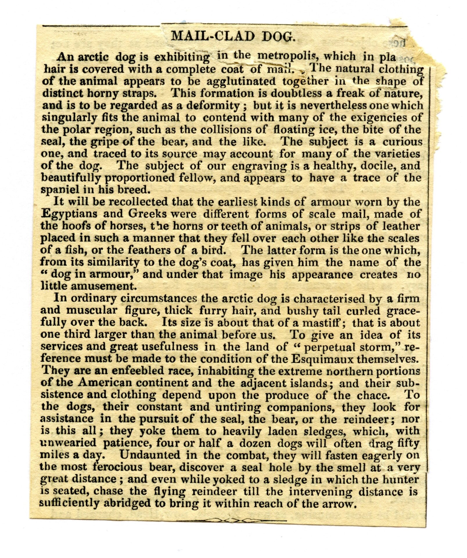The article is from The Pictorial Times of 22 August 1846.The newspaper article headed ‘Mail-clad Dog’ paints an impressive picture of this Artic dog. It is likely that this polar dog is the same as the dog featured in N3635.