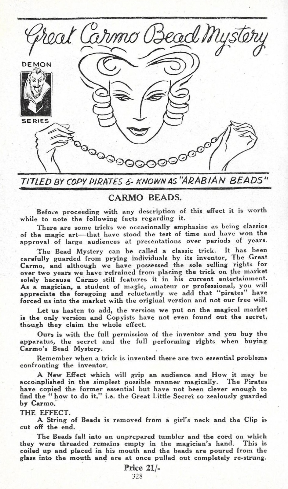 An advertisement illustrated here descibes the effect: “A string of beads is removed from a girl’s neck and the clip is cut off the end. The beads fall into an unprepared tumbler and the cord on which they are threaded remains empty in the magician’s hand. This is coiled up and placed in the mouth and the beads are poured from the glass into the mouth and are at once pulled out completely re-strung.” Complete with instructions.