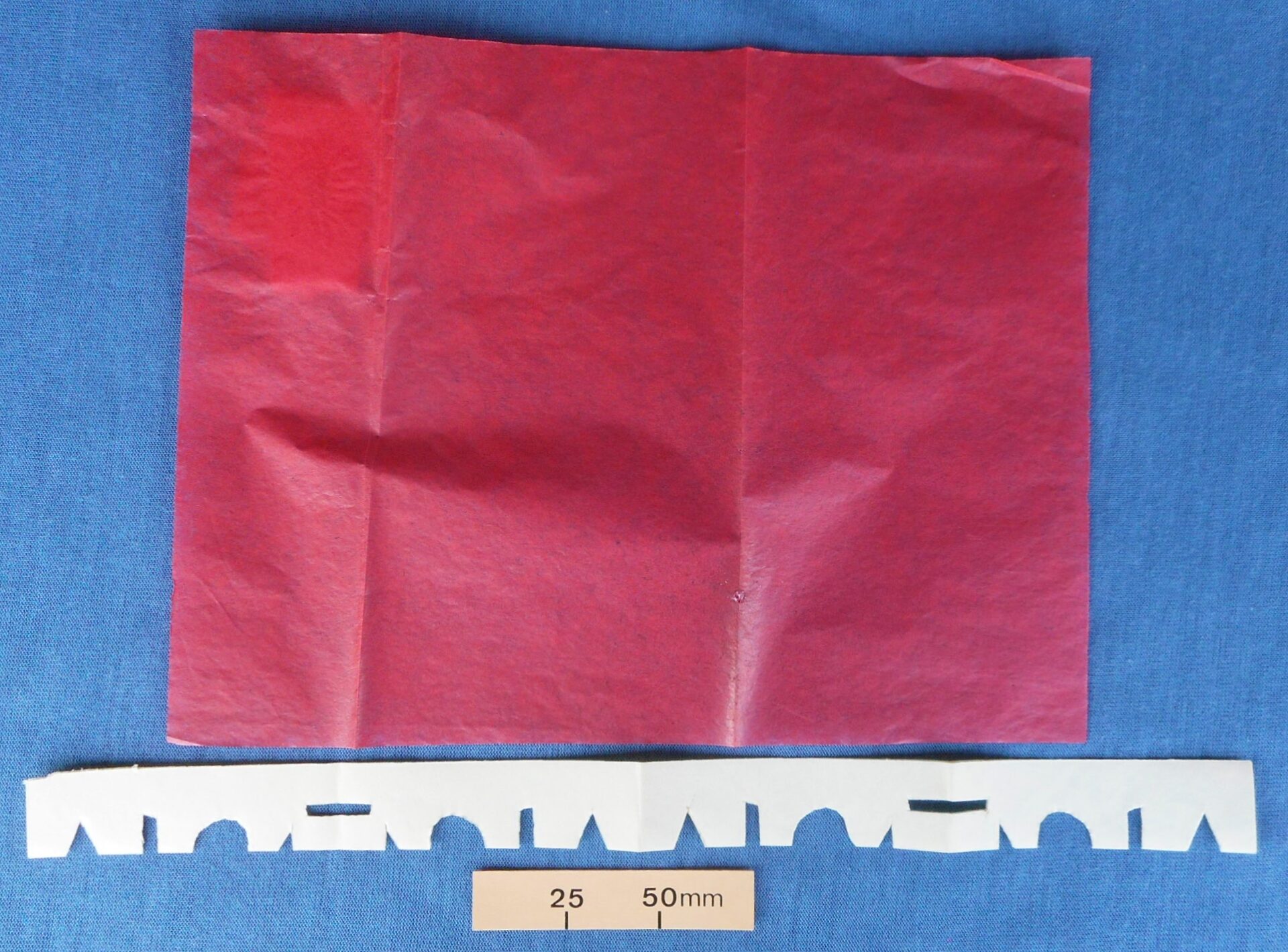 The magician tears up a piece of red tissue paper and a strip of white paper and transforms them into Paula’s panties. The envelope in which the trick was sold informs us that: ‘This Comedy Stunt is proving a Real Riot’. Complete with routine and patter copyright by Max Andrews of Vampire Magic.